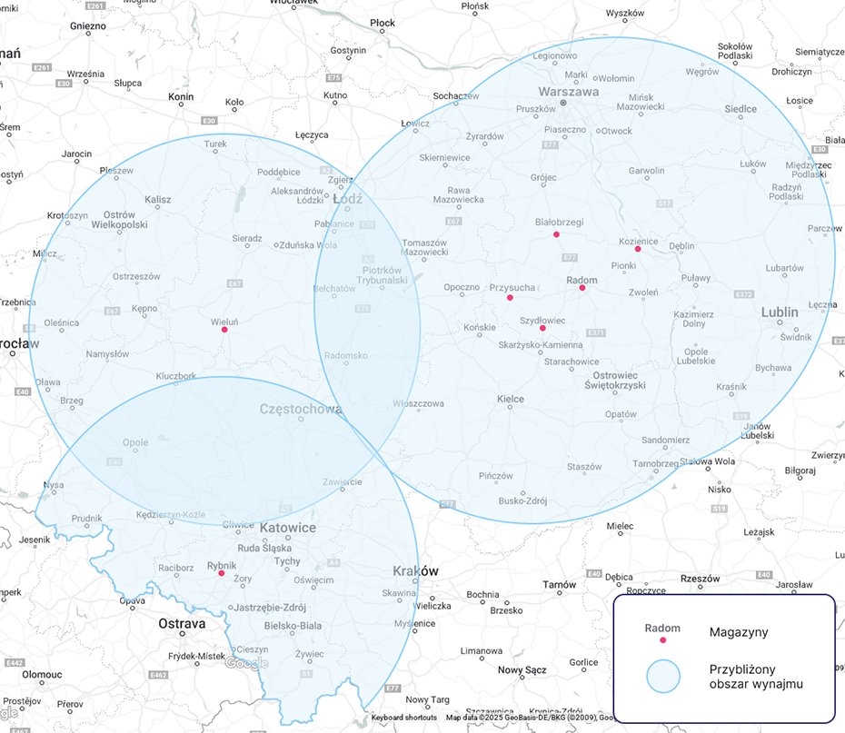 Poniższa mapa przedstawia obszar, na którym nasze produktu dostepne są na wynajem. W przypadku wątpliwości czy twoja miejscowość znajduje się w naszym zasięgu - zapraszamy do kontaktu